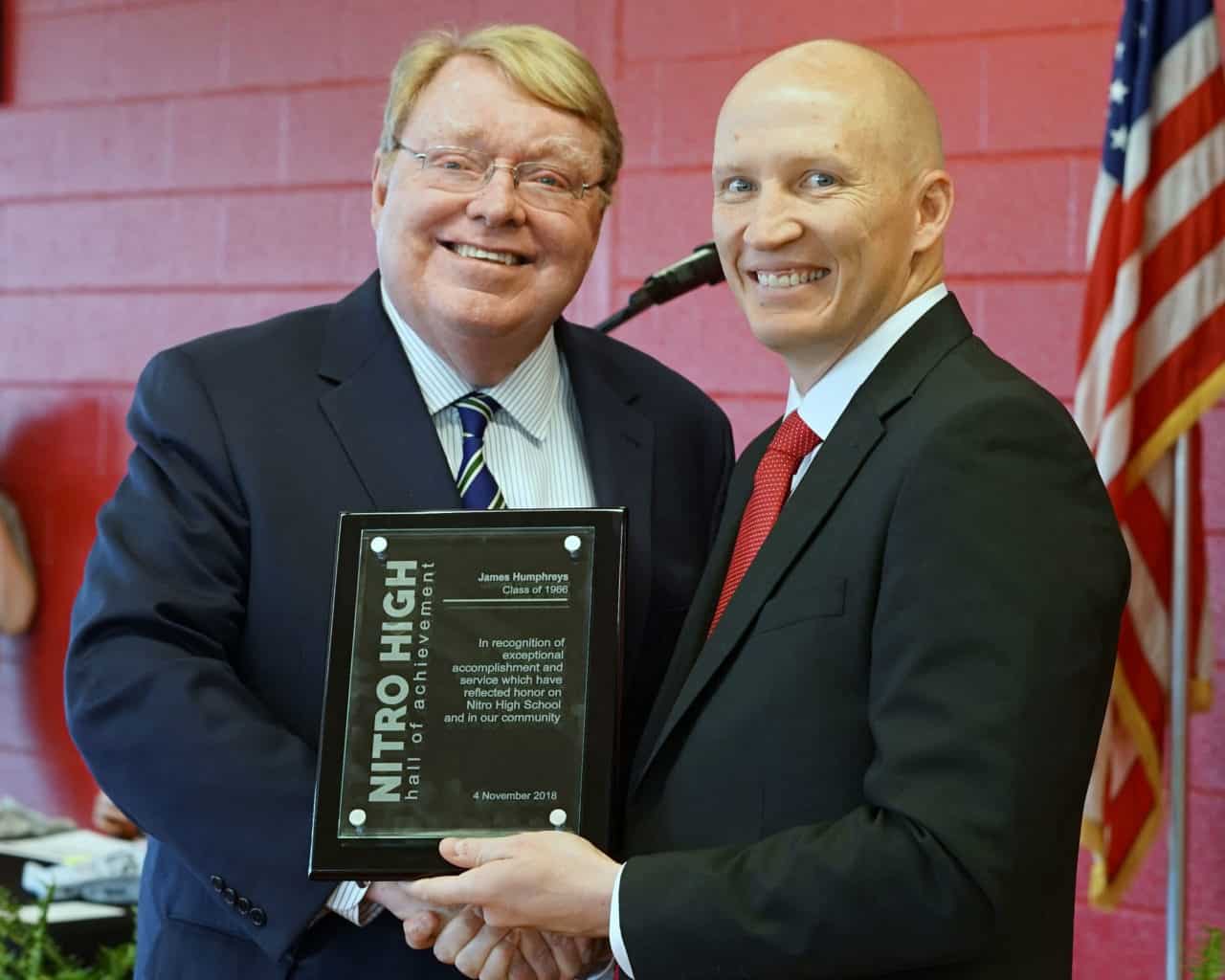 James F. Humphreys, a distinguished alumnus of Nitro High School, honored with an induction into the school’s Hall of Fame by Principal Jason Redman
